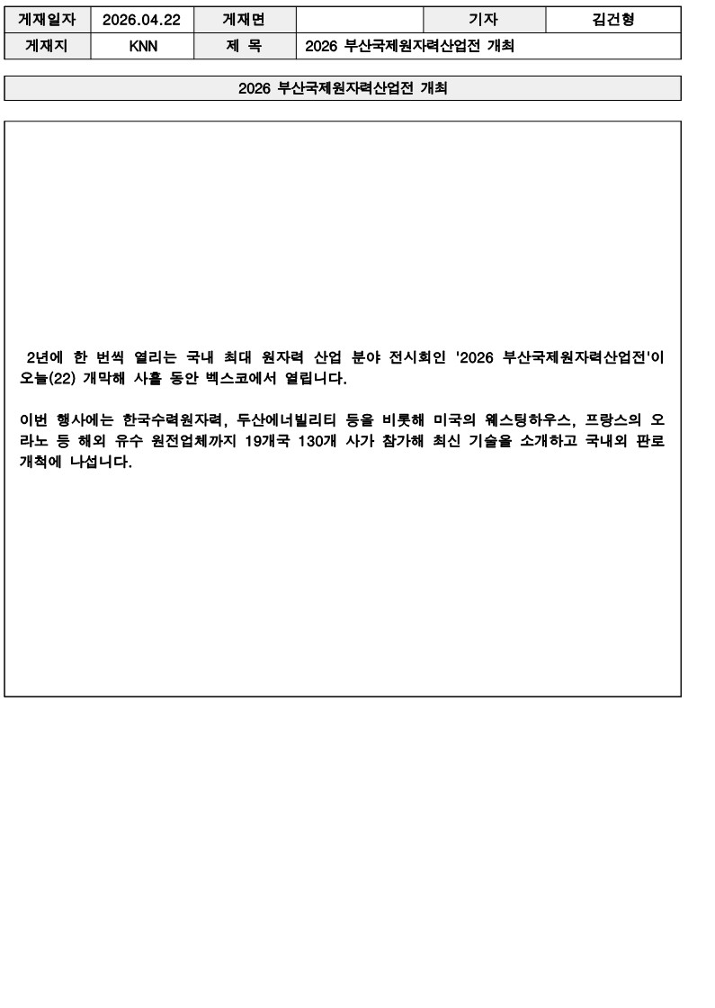 [KNN] 2026 부산국제원자력산업전 개최 2026-04-23 ▶▶▶ 뉴스 영상 및 기사 원문 바로가기 첨부파일 목록 이전글 [아이뉴스24] 부산국제원자력산업전, 벡스코서 개막…19개국 130개사 참여 다음글 [YTN] 부산국제원자력산업전 개막...벡스코에서 24일까지