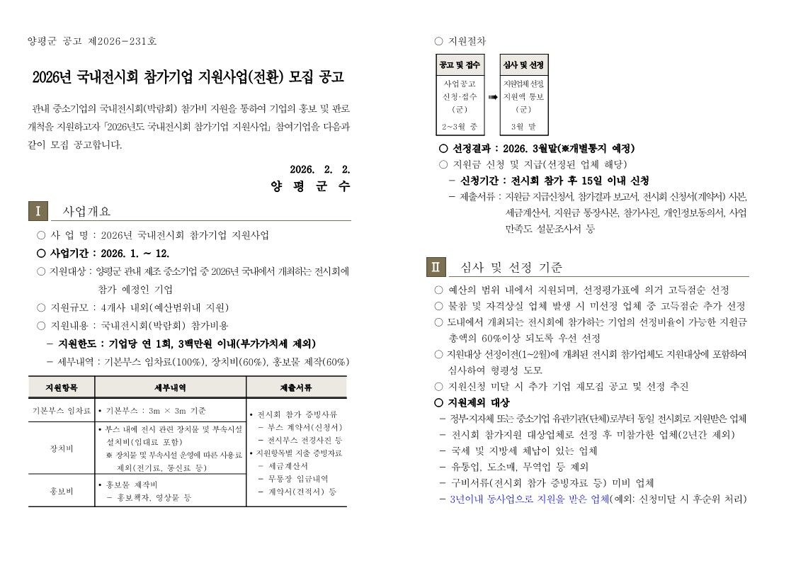 [경기 양평군] 2026년 국내전시회 참가기업 지원사업 모집 공고(~2.20까지)