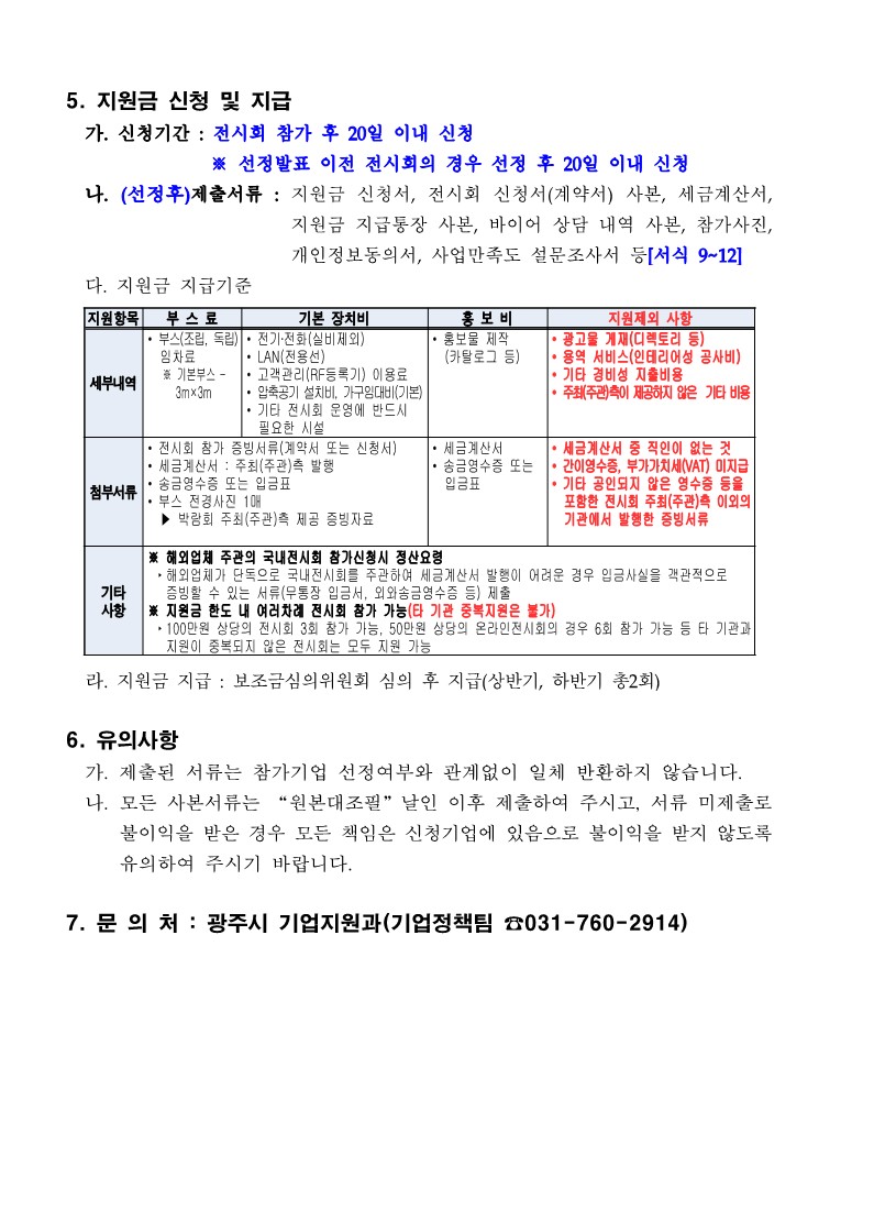[경기 광주시] 2026년 국내전시회 참가기업 지원사업 모집 공고(~2.23까지) 2026-02-10 ▶ 지원사업 확인하기 ◀ 첨부파일 2026년_국내전시회_참가기업_지원사업_모집_공고문.hwp (파일크기 : 119.5KB) 국내규격_인증범위.pdf (파일크기 : 73.98KB) 해외규격_인증_지원대상.pdf (파일크기 : 164.65KB) 목록 이전글 [경기 양평군] 2026년 국내전시회 참가기업 지원사업 모집 공고(~2.20까지) 다음글 [경기 오산시] 2026년 국내 및 해외 전시회 참가기업지원사업 공고(~3.5까지)