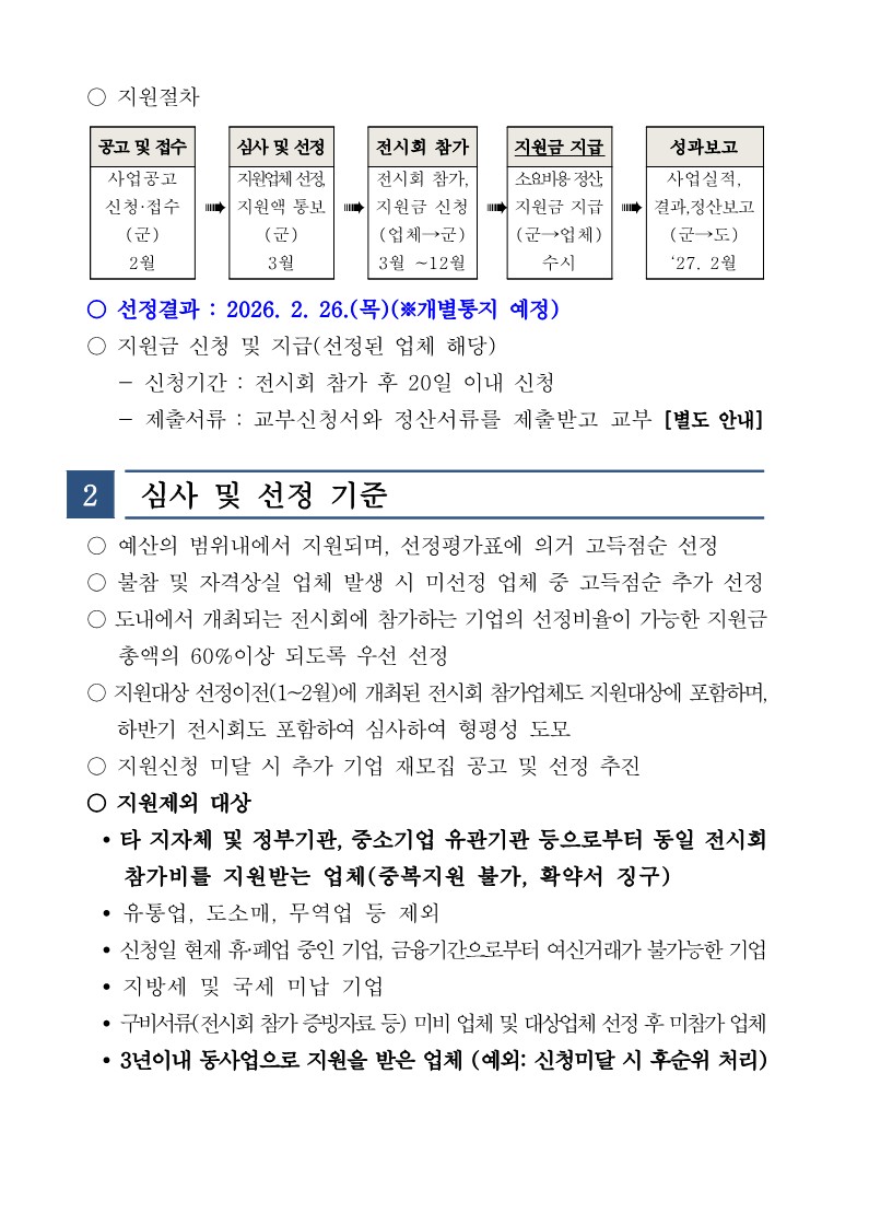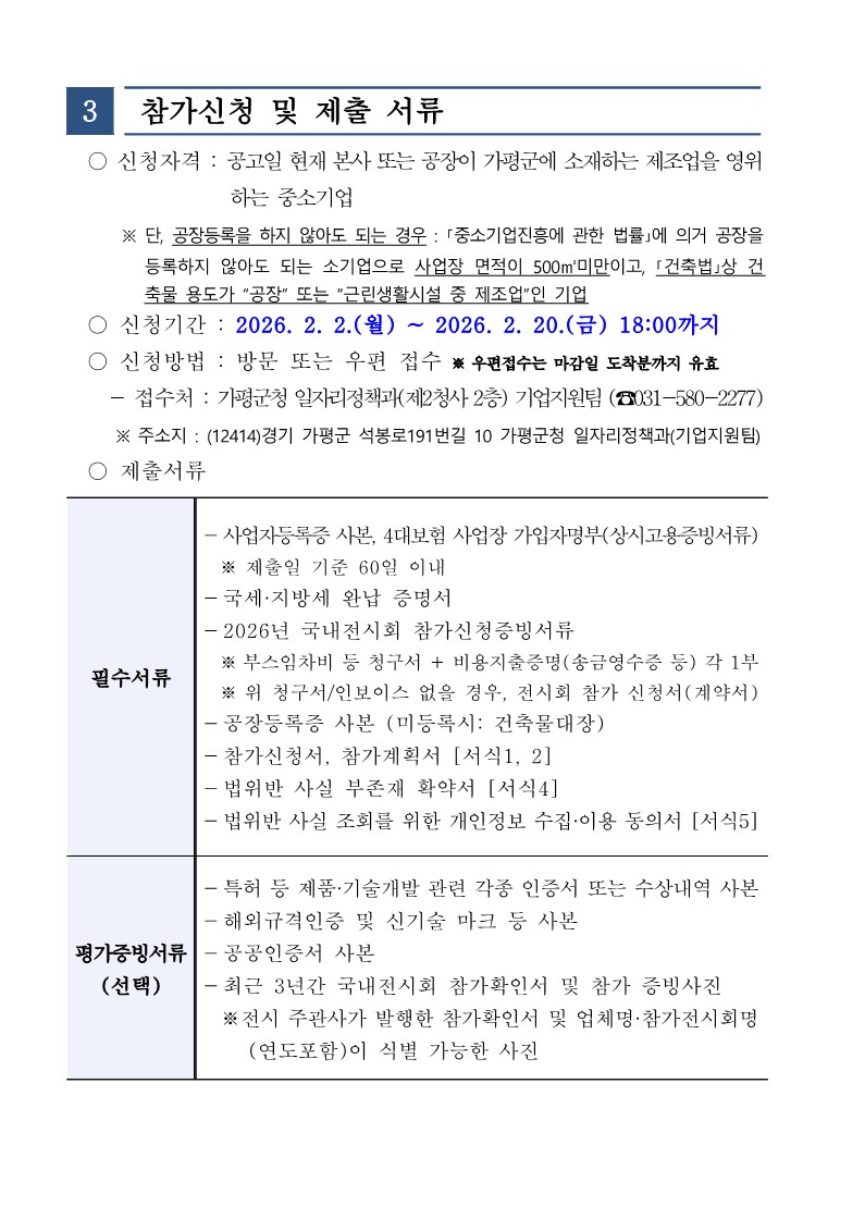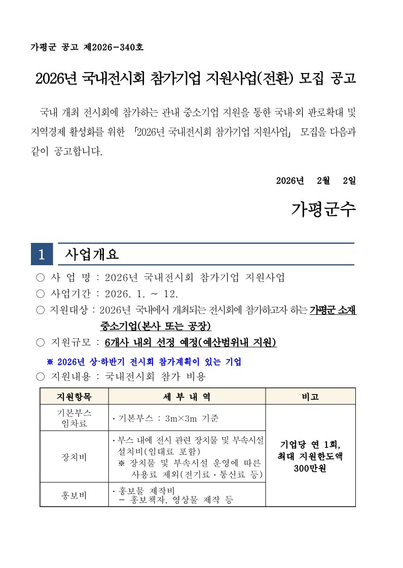 [경기 가평군] 2026년 국내전시회 참가기업 지원사업 모집 공고(~2.20까지) 2026-02-11 ▶ 지원사업 확인하기 ◀ 첨부파일 2026년_국내전시회_참가기업_지원사업_공고.hwp (파일크기 : 162.5KB) 목록 이전글 [경기 오산시] 2026년 국내 및 해외 전시회 참가기업지원사업 공고(~3.5까지) 다음글 [경남 거창군] 2026년 거창군 기업지원 보조사업 신청 안내 공고(~예산소진시까지)