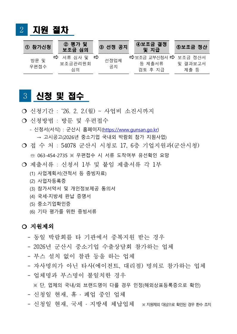 [전북 군산시] 2026년 중소기업 국내외 박람회 참가지원사업 공고(~예산소진시까지) 2026-02-11 ▶ 지원사업 확인하기 ◀ 첨부파일 2026년_중소기업_국내외_박람회_참가지원_사업_공고문.hwp (파일크기 : 107.5KB) 목록 이전글 [경남 거창군] 2026년 거창군 기업지원 보조사업 신청 안내 공고(~예산소진시까지) 다음글 [인천 부평구] 2026년 부평구 국내전시회 개별참가 지원사업(~3.4까지)