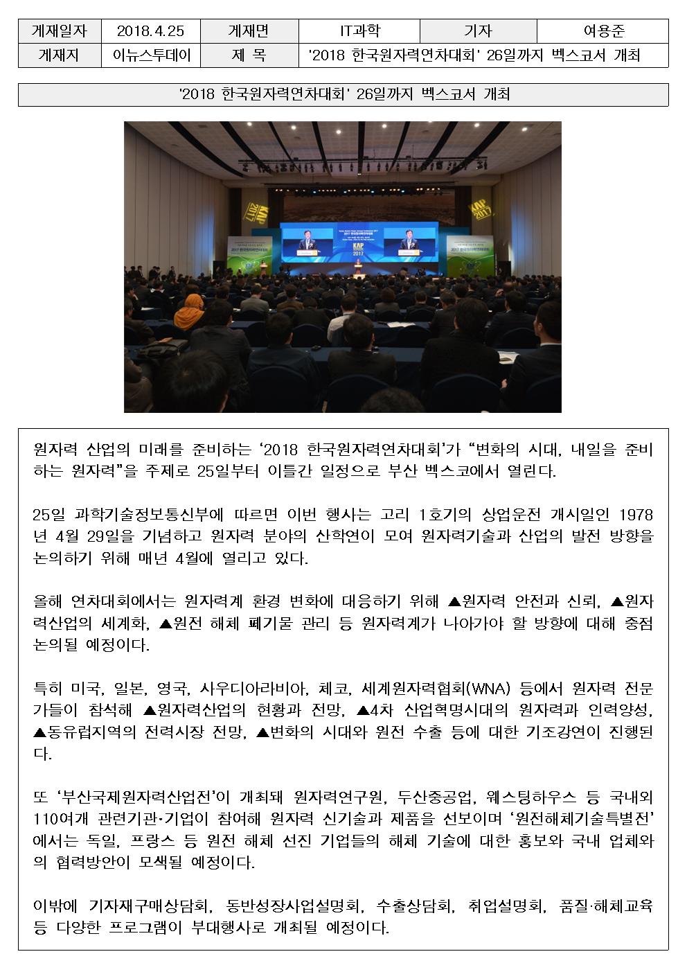 [이뉴스투데이] '2018 한국원자력연차대회' 26일까지 벡스코서 개최 (2018.04.25) 2020-03-11 [기사 원문 바로가기 : https://url.kr/GVblIu] 첨부파일 목록 이전글 [연합뉴스] 부산국제원자력산업 전시회 개막…10개국 기업 110곳 참가 (2018.04.25) 다음글 [헬로디디] 원자력연차대회 25일 개최···10개 국가 110개 기업 참가 (2018.04.25)