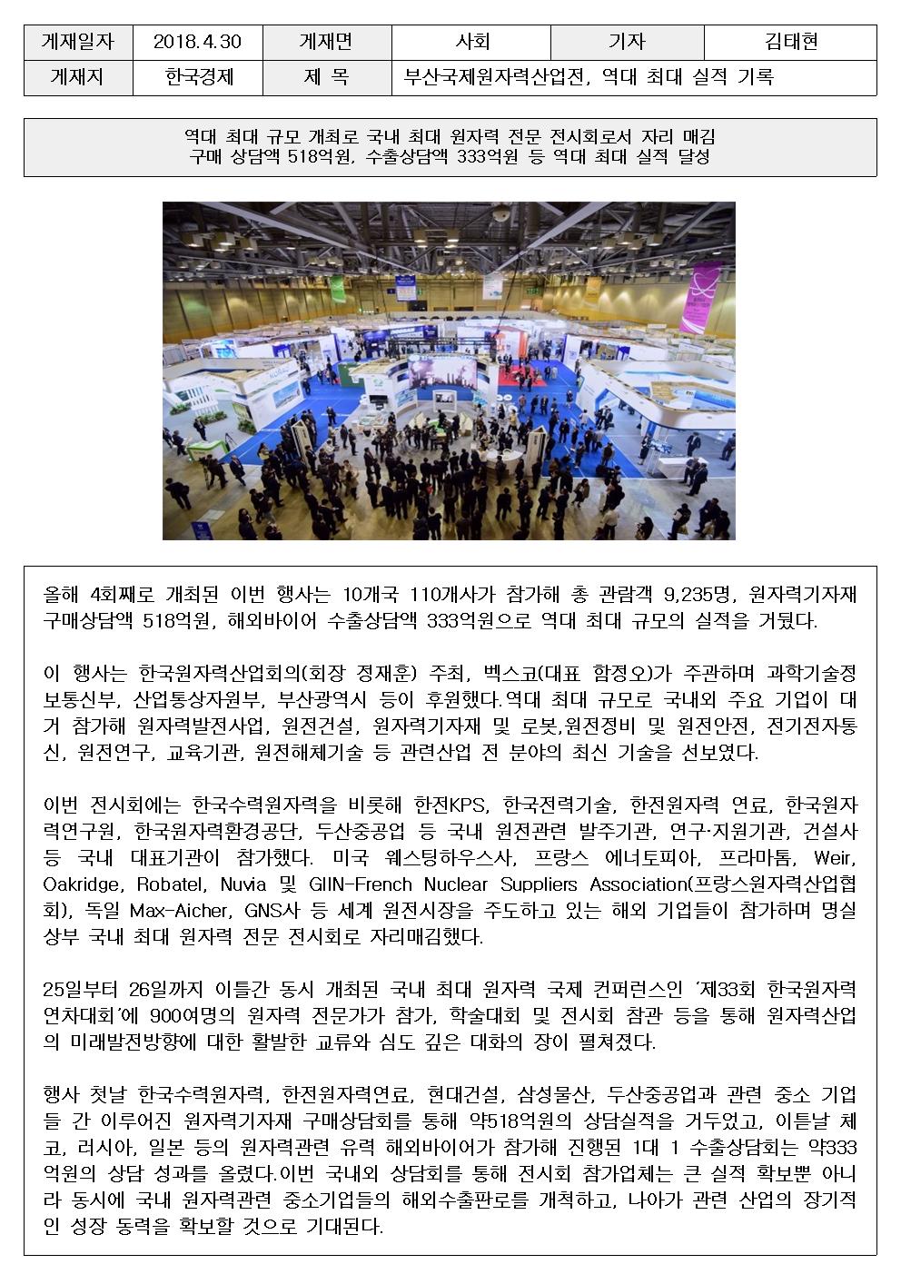 [한국경제] 부산국제원자력산업전, 역대 최대 실적 기록 (2018.04.30) 2020-03-11 [기사 원문 바로가기 : https://url.kr/8ytgxU] 첨부파일 목록 이전글 [헬로디디] 원자력연차대회 25일 개최···10개 국가 110개 기업 참가 (2018.04.25) 다음글 [부산일보] 벡스코, 2018 부산국제원자력산업전 역대 최대 실적 - 성황리에 폐막 (2018.04.30)