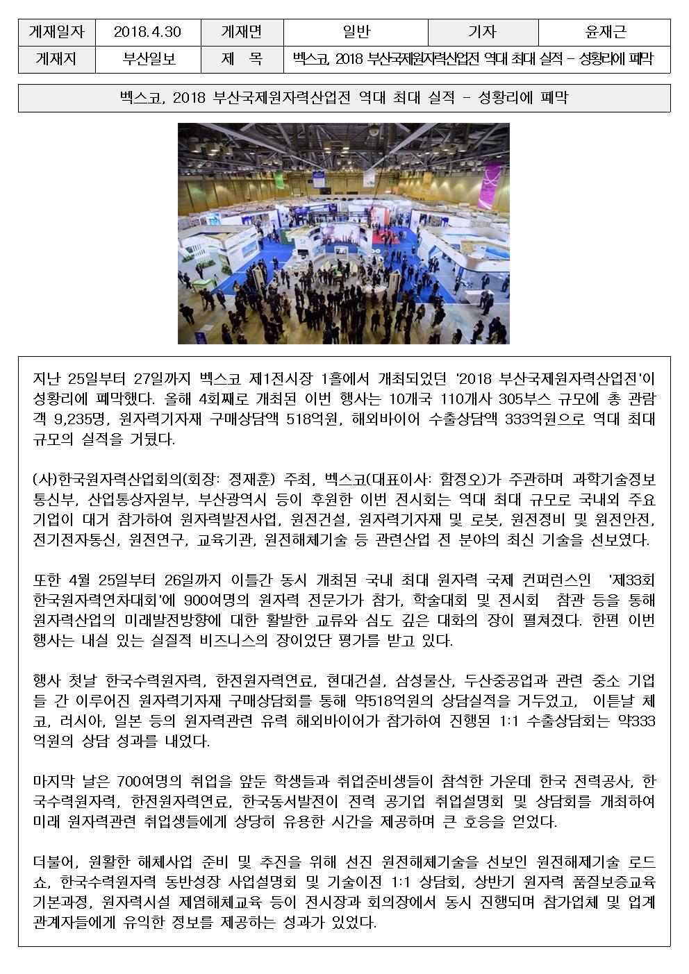 [부산일보] 벡스코, 2018 부산국제원자력산업전 역대 최대 실적 - 성황리에 폐막 (2018.04.30) 2020-03-11 [기사 원문 바로가기 : https://url.kr/HxqG3W] 첨부파일 목록 이전글 [한국경제] 부산국제원자력산업전, 역대 최대 실적 기록 (2018.04.30) 다음글 [국제뉴스] 부산시 '2018 부산국제원자력산업전' 성황리 폐막, 관람객 9200여명 방문 (2018.04.30)