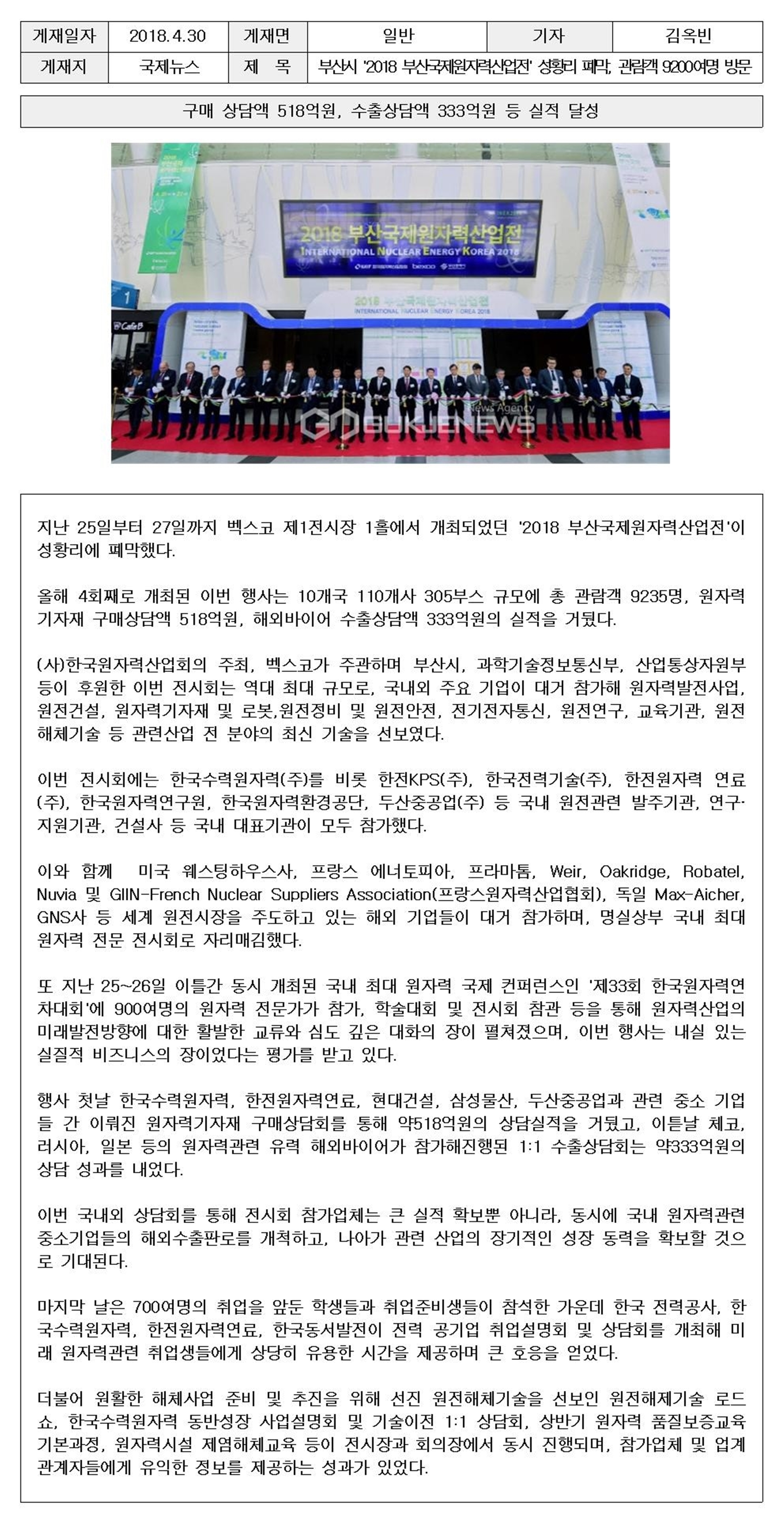 [국제뉴스] 부산시 '2018 부산국제원자력산업전' 성황리 폐막, 관람객 9200여명 방문 (2018.04.30) 2020-03-11 [기사 원문 바로가기 : https://url.kr/X5Sc9P] 첨부파일 목록 이전글 [부산일보] 벡스코, 2018 부산국제원자력산업전 역대 최대 실적 - 성황리에 폐막 (2018.04.30) 다음글 [에너지경제] 원자력연차대회·부산국제원자력산업전 7월로 연기 (2020.03.27)