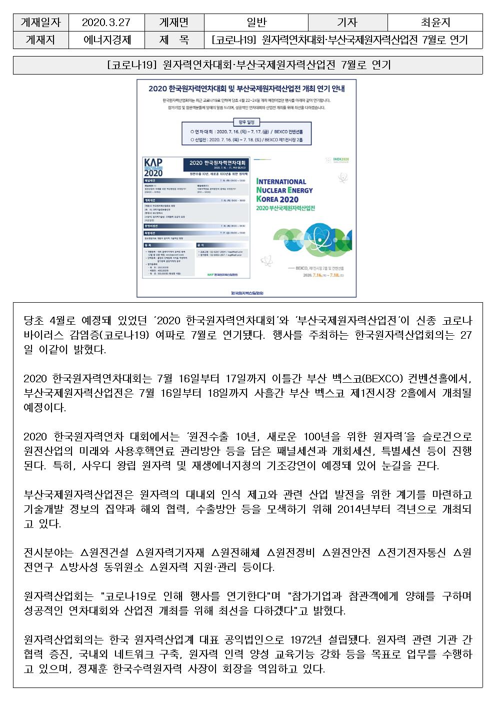 [에너지경제] 원자력연차대회·부산국제원자력산업전 7월로 연기 (2020.03.27) 2020-04-02 [ 기사 원문 바로가기 : https://url.kr/bfdGDq ] 첨부파일 목록 이전글 [국제뉴스] 부산시 '2018 부산국제원자력산업전' 성황리 폐막, 관람객 9200여명 방문 (2018.04.30) 다음글 [부산일보] 2020 부산국제원자력산업전 성황리에 개막