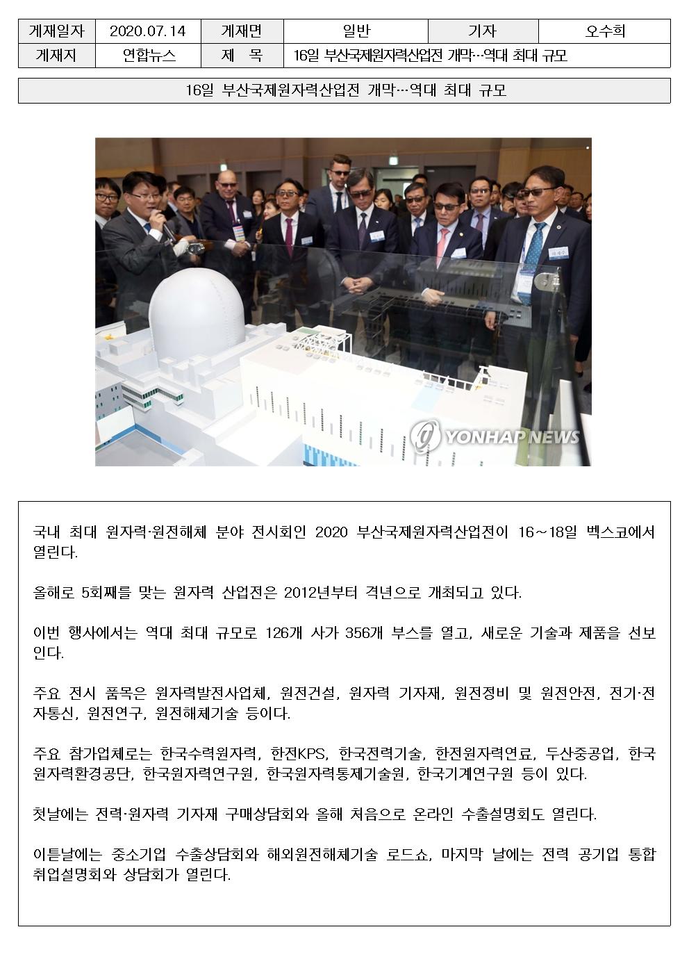[연합뉴스] 16일 부산국제원자력산업전 개막…역대 최대 규모 2020-07-24 [기사 원문 바로가기 : https://url.kr/Fd5NI2] 첨부파일 목록 이전글 [리더스경제] 코로나19 뚫고 '역대최대 규모', 2020 부산국제원자력산업전 개막 다음글 [한국정경신문] 부산시, '2020 부산국제원자력산업전' 성황리에 폐막