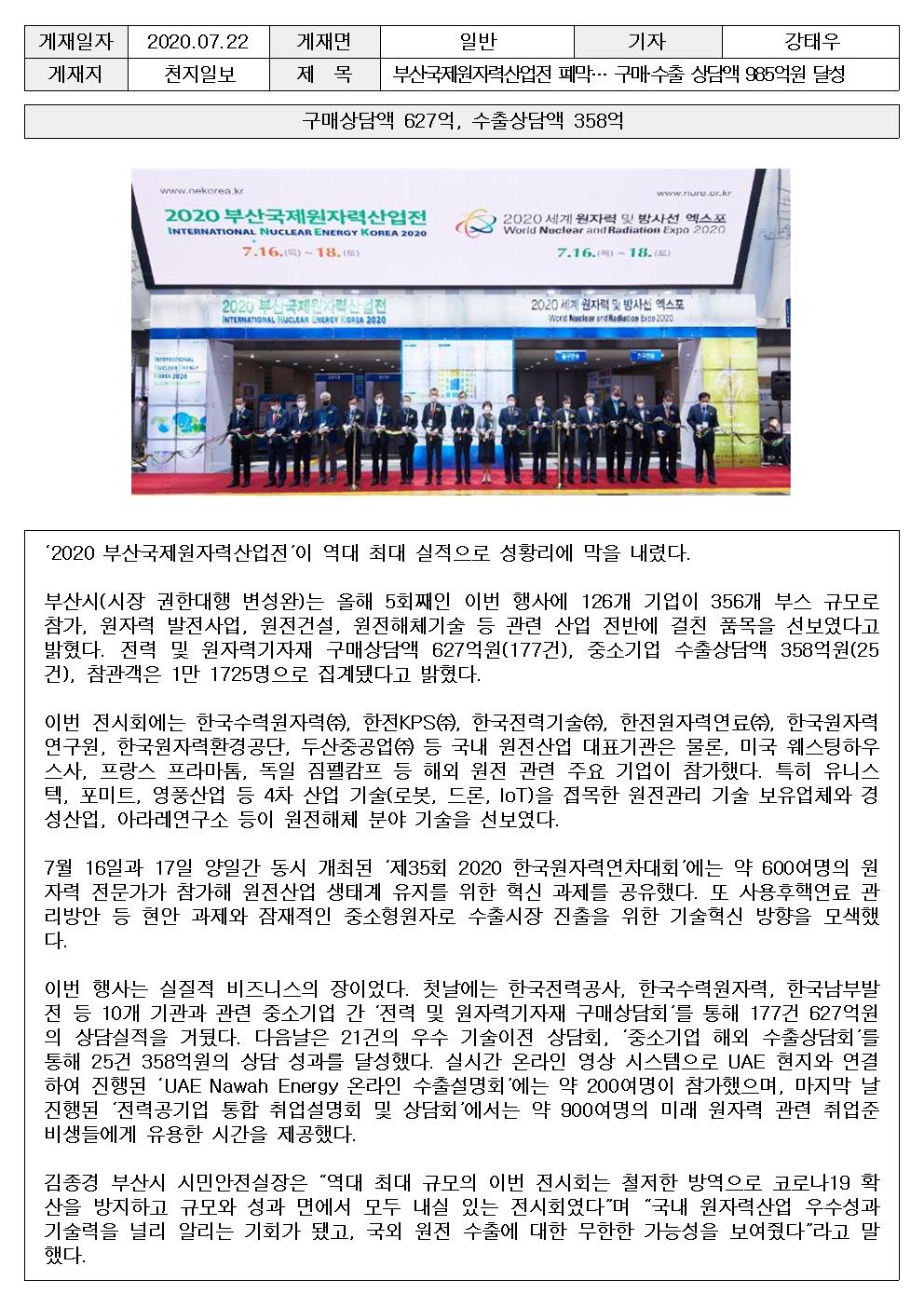 [천지일보] 부산국제원자력산업전 폐막… 구매·수출 상담액 985억원 달성 2020-07-27 [기사 원문 바로가기 : https://url.kr/hzVW4n] 첨부파일 목록 이전글 [연합뉴스] 2020 부산 국제원자력산업전 폐막…사흘간 1만1천725명 참관 다음글 [MBN] 원전수출 첫걸음 발대식…"2027년까지 5,300억 수주"