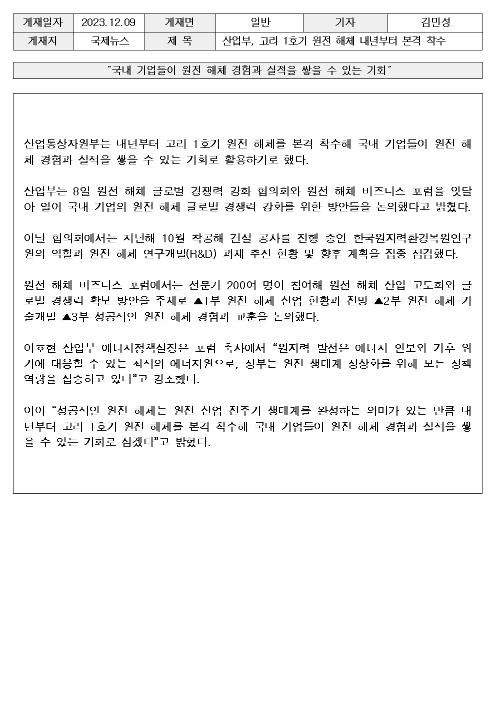 [국제뉴스] 산업부, 고리 1호기 원전 해체 내년부터 본격 착수 2023-12-11 [기사 원문 바로가기 : 산업부, 고리 1호기 원전 해체 내년부터 본격 착수 < 사회일반 < 사회 < 기사본문 - 국제뉴스 (gukjenews.com)] 첨부파일 목록 이전글 [MBN] 원전수출 첫걸음 발대식…"2027년까지 5,300억 수주" 다음글 [아시아경제] 원전 지원 예산 30% 이상 늘려…산업부, 내년 예산 11조 5188억 확정