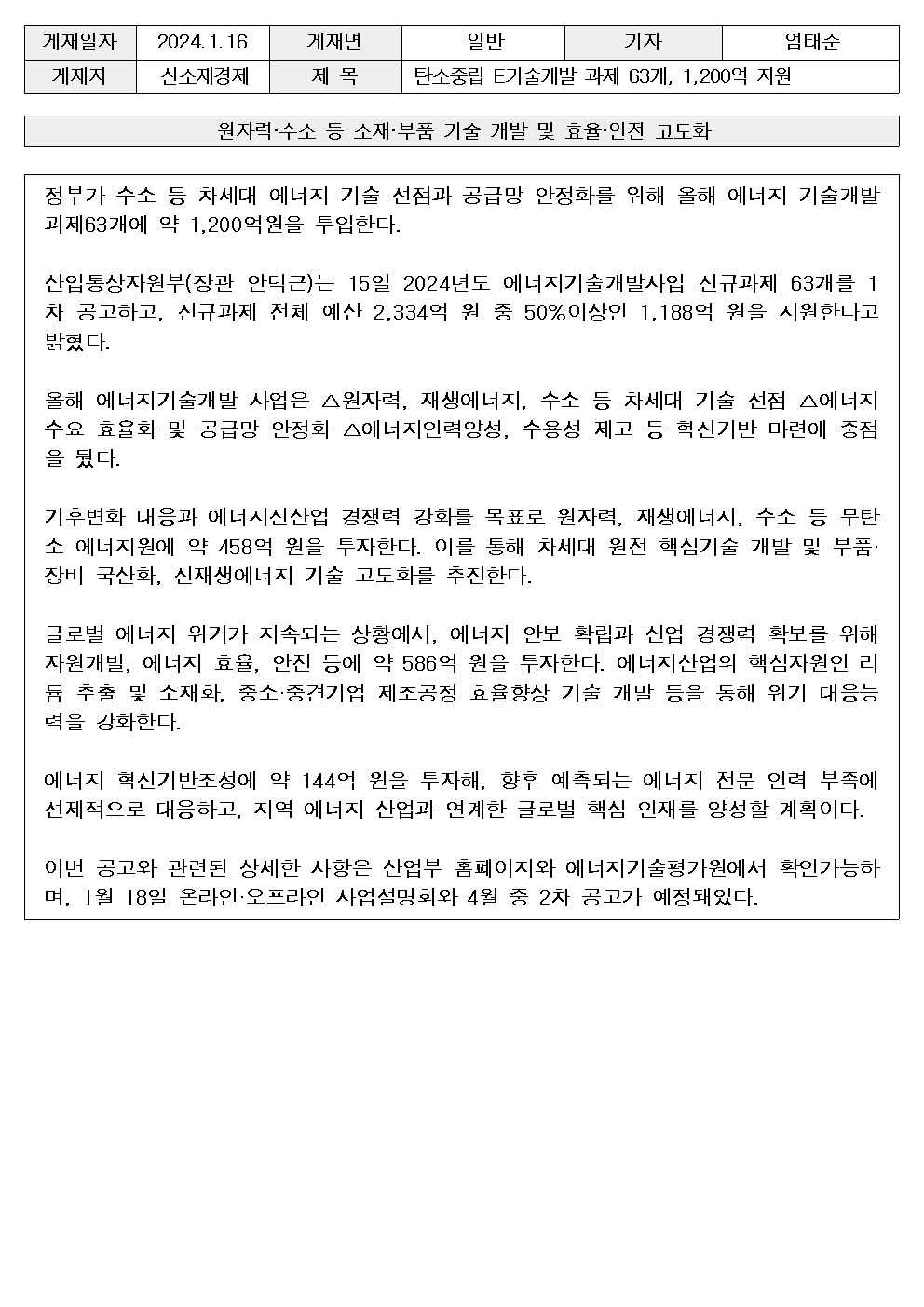 [신소재경제] 탄소중립 E기술개발 과제 63개, 1,200억 지원 2024-01-18 [기사 원문 바로가기 :http://amenews.kr/news/view.php?idx=56283 ] 첨부파일 목록 이전글 [아시아경제] 원전 지원 예산 30% 이상 늘려…산업부, 내년 예산 11조 5188억 확정 다음글 [연합뉴스] 국내 최대 규모 원자력산업 전문 전시회, 24일 부산서 개막