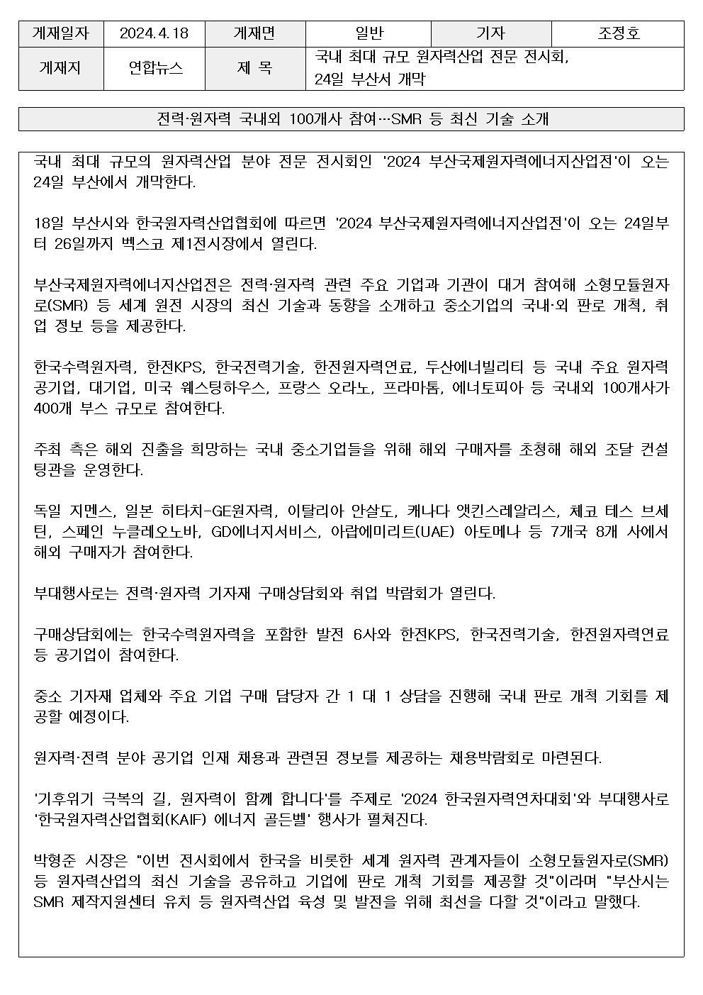 [연합뉴스] 국내 최대 규모 원자력산업 전문 전시회, 24일 부산서 개막 2024-05-16 기사 원문 바로가기 : https://www.yna.co.kr/view/AKR20240418024300051?input=1195m 첨부파일 목록 이전글 [신소재경제] 탄소중립 E기술개발 과제 63개, 1,200억 지원 다음글 ★ 2024 부산국제원자력에너지산업전 소식