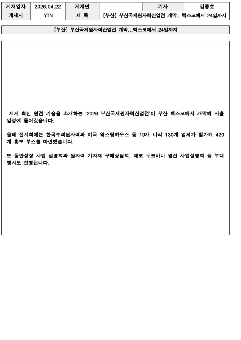 [YTN] 부산국제원자력산업전 개막...벡스코에서 24일까지 2026-04-23 ▶▶▶ 뉴스 영상 및 기사 원문 바로가기 첨부파일 목록 이전글 [KNN] 2026 부산국제원자력산업전 개최 다음글 [포인트경제] [현장] 부산 벡스코, K-원전 르네상스 현장 되다