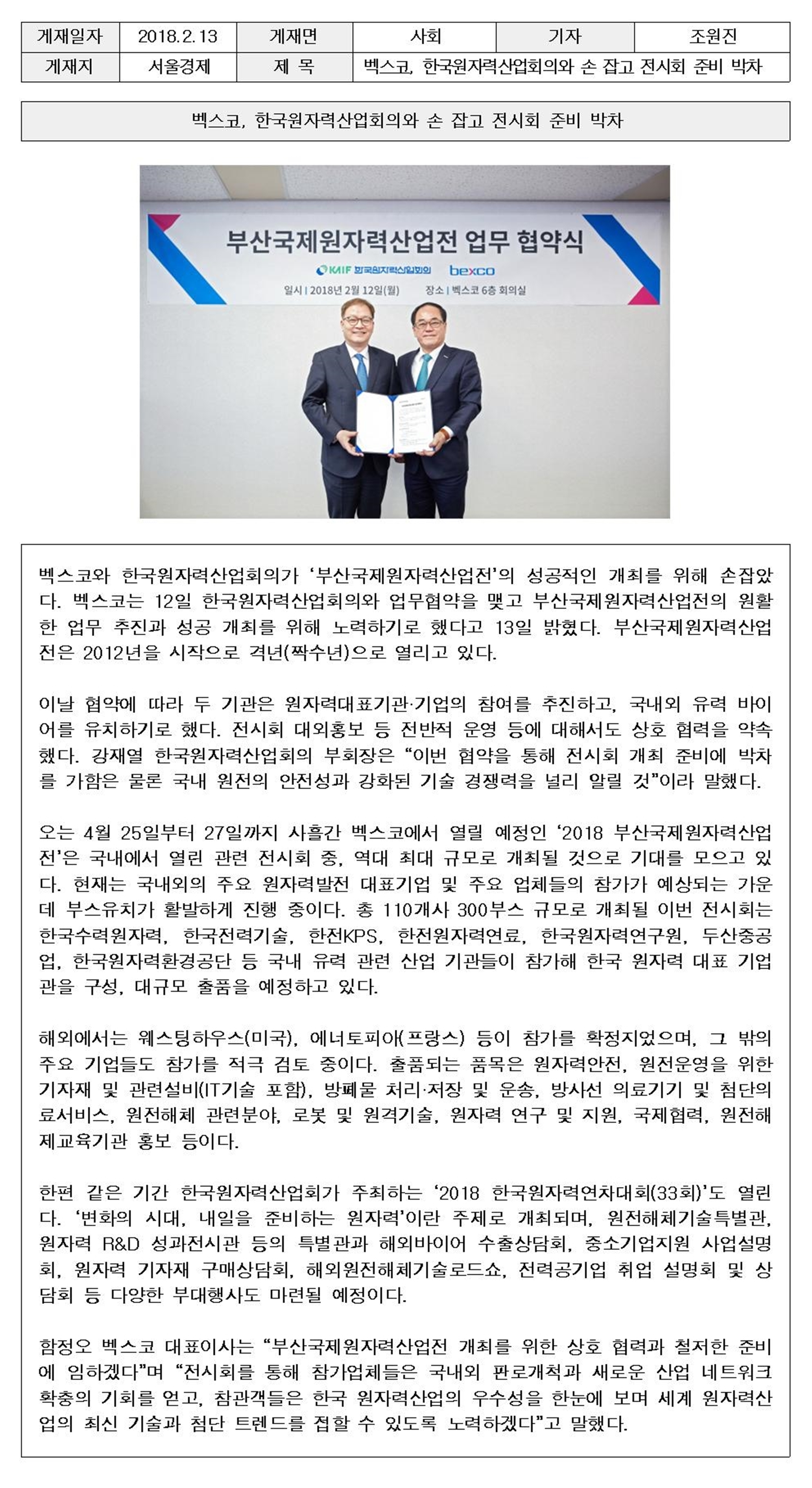 [서울경제] 벡스코, 한국원자력산업회의와 손 잡고 전시회 준비 박차 (2018.02.13) 2020-03-11 [기사 원문 바로가기 : https://url.kr/Ok2wy7] 첨부파일 목록 이전글 이전글이 없습니다. 다음글 [국제신문] 세계 최첨단 원전기술 벡스코에 모인다 (2018.04.24)