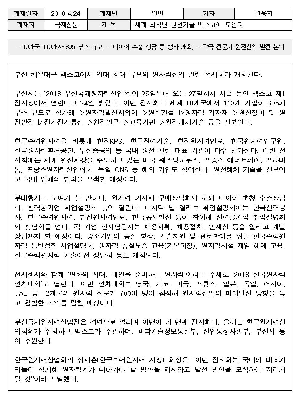 [국제신문] 세계 최첨단 원전기술 벡스코에 모인다 (2018.04.24) 2020-03-11 [기사 원문 바로가기 : https://url.kr/pef3wh] 첨부파일 목록 이전글 [서울경제] 벡스코, 한국원자력산업회의와 손 잡고 전시회 준비 박차 (2018.02.13) 다음글 [브레이크뉴스] 2018 부산국제원자력산업전 25~27일 벡스코서 개최 (2018.04.24)