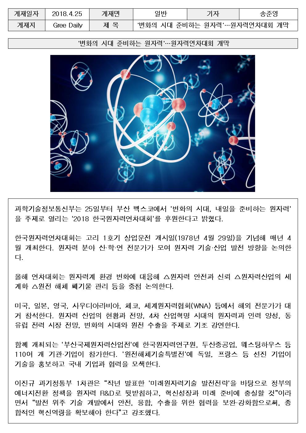 [그린데일리] '변화의 시대 준비하는 원자력'…원자력연차대회 개막 (2018.04.25) 2020-03-11 [기사 원문 바로가기 : https://url.kr/YZmHDS] 첨부파일 목록 이전글 [브레이크뉴스] 2018 부산국제원자력산업전 25~27일 벡스코서 개최 (2018.04.24) 다음글 [머니투데이] 부산국제원자력산업전 개막 (2018.04.25)