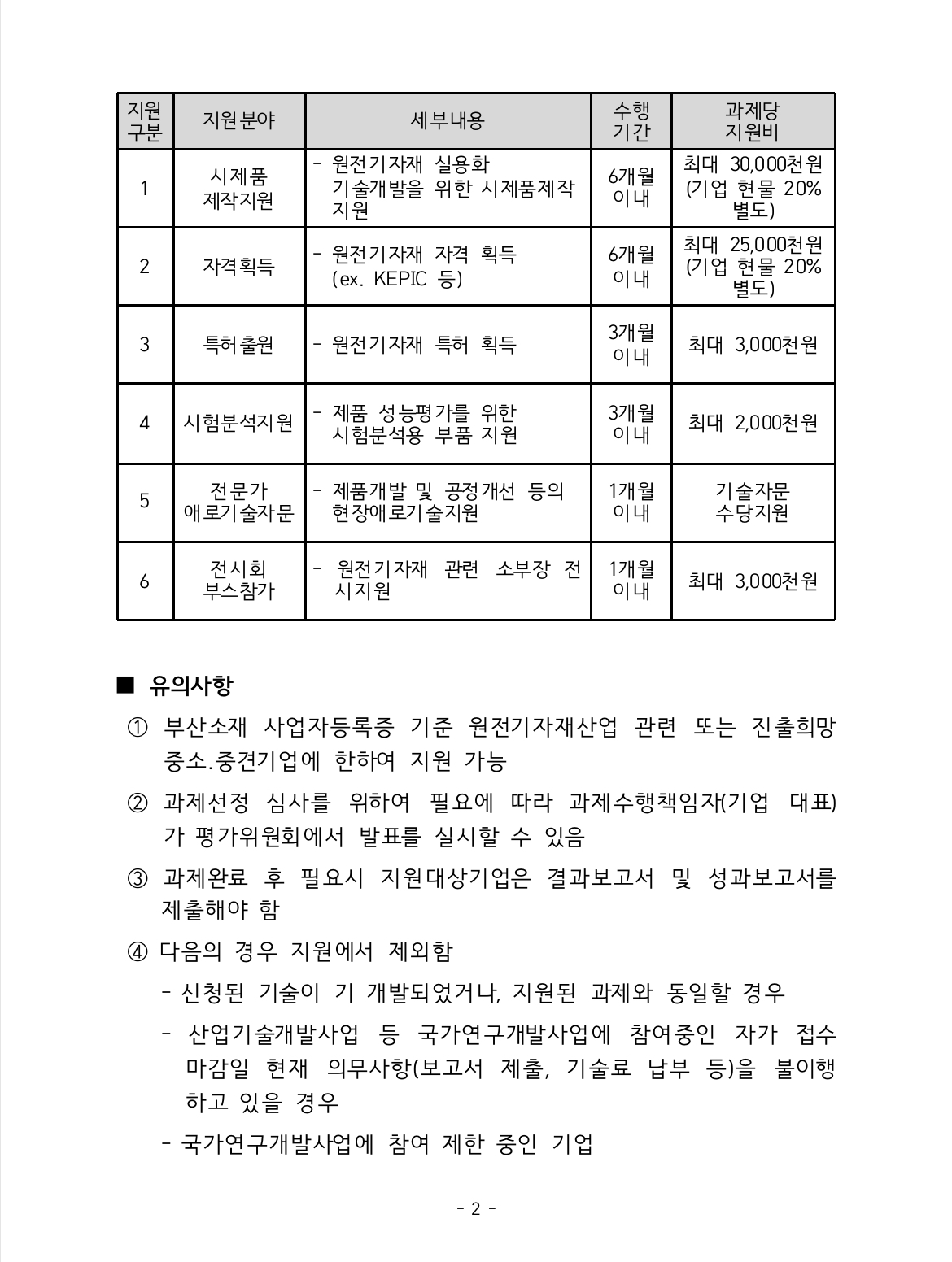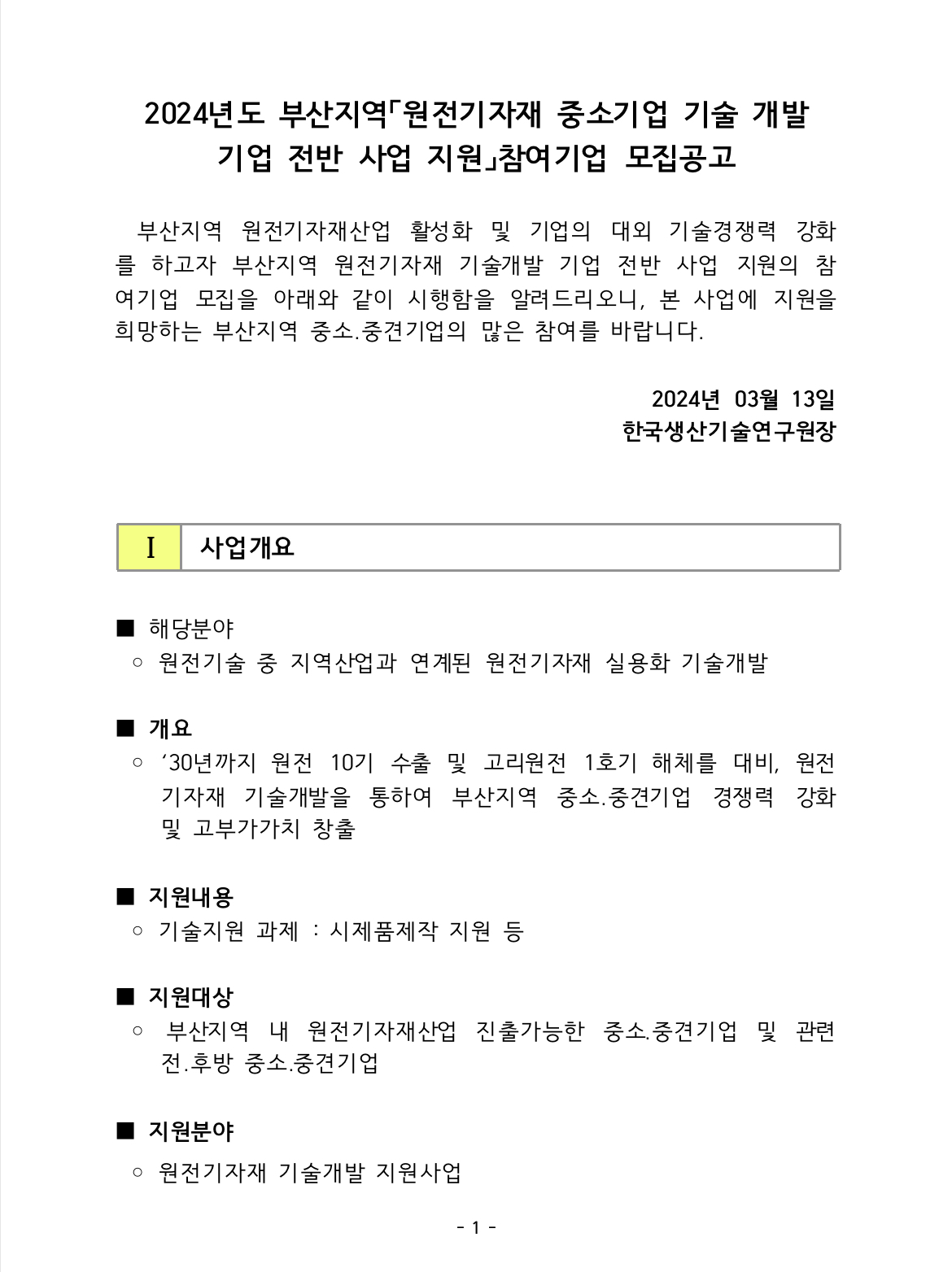[한국생산기술연구원] 2024년도 부산지역「원전기자재 중소기업 기술 개발 기업 전반 사업 지원」참여기업 모집공고
