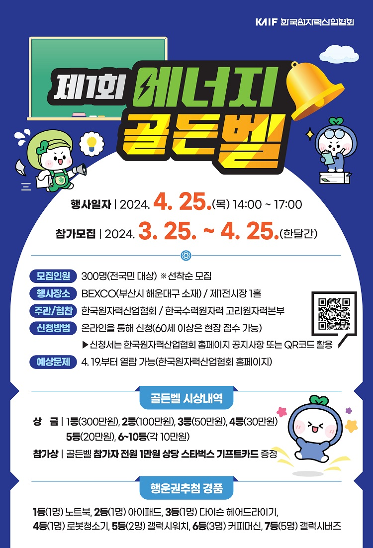 [한국원자력산업협회] 제1회 에너지 골든벨 참가자 모집 2024-03-26 첨부파일 목록 이전글 [한국생산기술연구원] 2024년도 부산지역「원전기자재 중소기업 기술 개발 기업 전반 사업 지원」참여기업 모집공고 다음글 [한국원자력산업협회/한국수력원자력] 중소기업 품질시스템 구축 지원사업