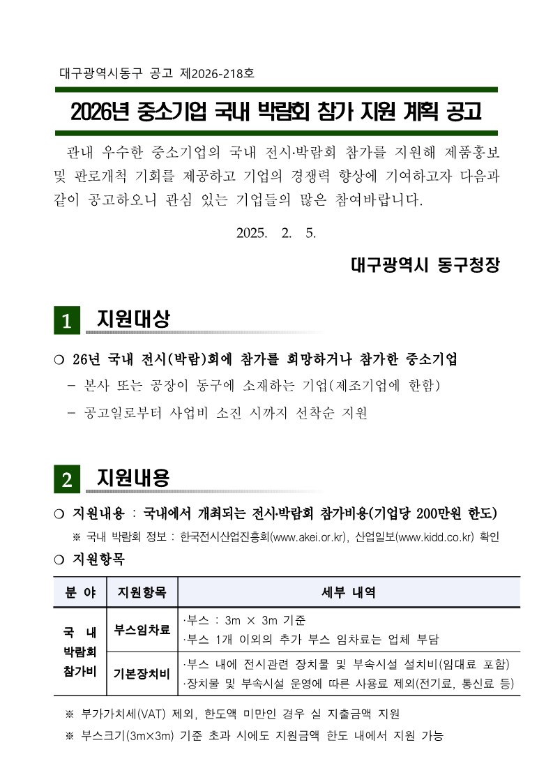 [대구 동구] 2026년 중소기업 국내 박람회 참가 지원 사업 공고(~예산소진시까지) 2026-02-12 ▶ 지원사업 확인하기 ◀ 첨부파일 2026년_중소기업_국내_전시(박람)회_참가_지원사업_공고.pdf (파일크기 : 462.65KB) [서식1~7]_지원신청서_등_일체.hwp (파일크기 : 84.5KB) 목록 이전글 [경기 이천시] 2026년도 국내전시회 개별참가 지원사업 공고(~2.27까지) 다음글 [경기 평택시] 2026년 국내전시회 참가기업 지원 계획 공고(~3.13까지)