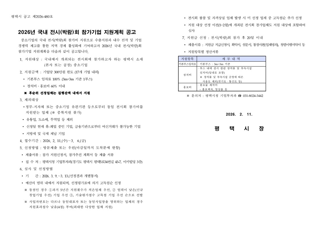 [경기 평택시] 2026년 국내전시회 참가기업 지원 계획 공고(~3.13까지) 2026-02-12 ▶ 지원사업 확인하기 ◀ 첨부파일 2026년_국내전시회_참가기업_지원_공고문.hwp (파일크기 : 184.5KB) 목록 이전글 [대구 동구] 2026년 중소기업 국내 박람회 참가 지원 사업 공고(~예산소진시까지) 다음글 [경기 수원시] 2026년 국내 박람회 개별 참가업체 지원 신청기업 모집 공고(~3.10까지)